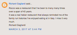 I ate at Rocco’s a number of times over the years. It was a great little Old School New York Italian Red Sauce Joint as they say. Nothing fancy, just good solid Italian Cusine the way we like it New York and the NY Metro Area, including New Jersey, Conn., and Philly. Rocco’s menu was classic old school Italian-American Red Sauce fare with such items as ; Baked Clams Oreganata, Insalata Caprese, Spaghetti with Clam Sauce, Lasagna, Manicotti, Veal Saltimbocca, Picata and all the usual suspects you’d get in a your classic old school New York Italian restaurant.